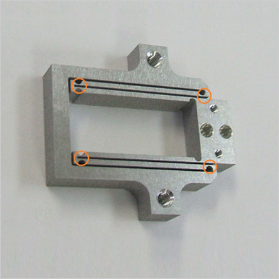成型した電極を加工物に押しつけて、電極の反対の形を作るのが形彫り放電加工。電極線を使って、糸鋸のように工作物を切断していくのがワイヤー放電加工(ワイヤーカット)です。弊社は、形彫り放電加工機1台とワイヤー放電加工機を3台保有しています。